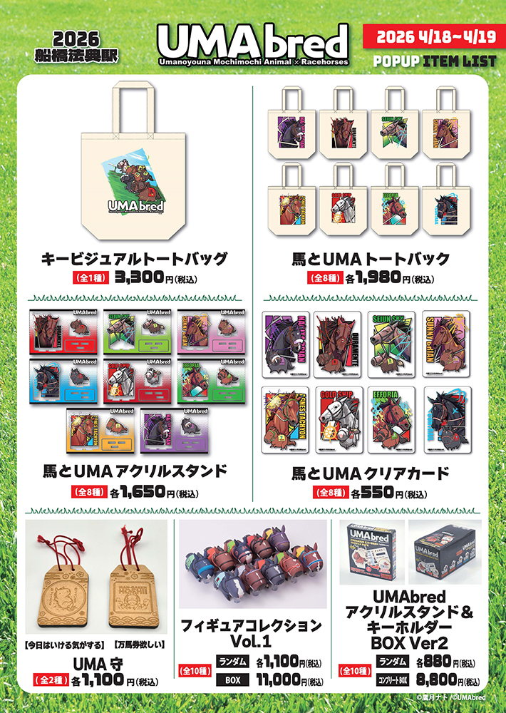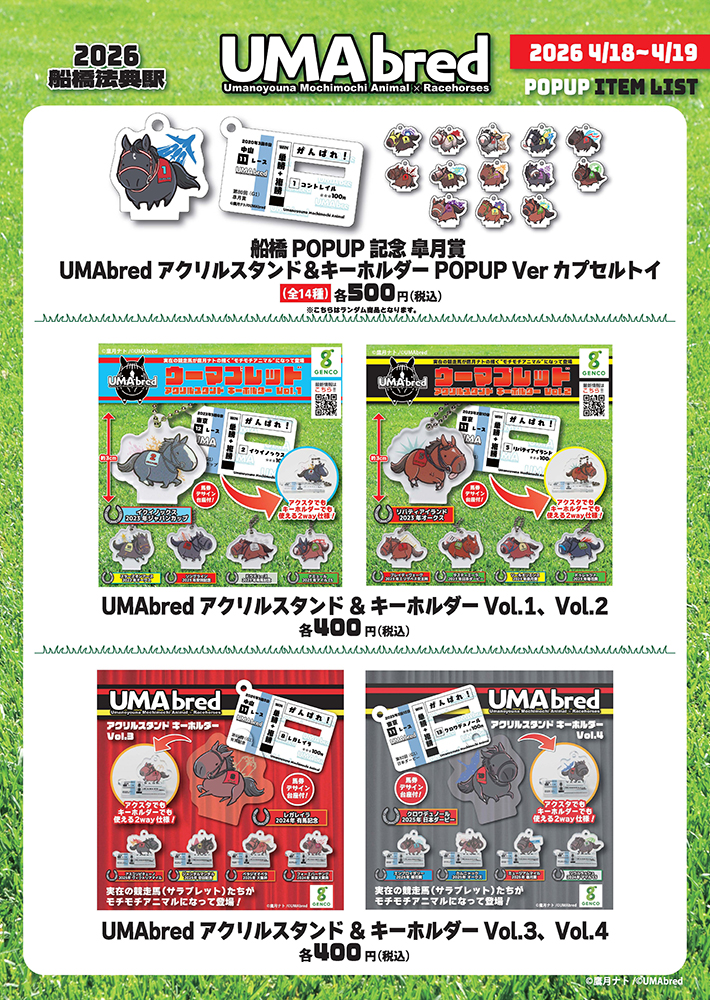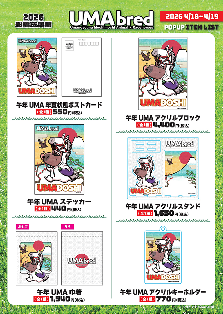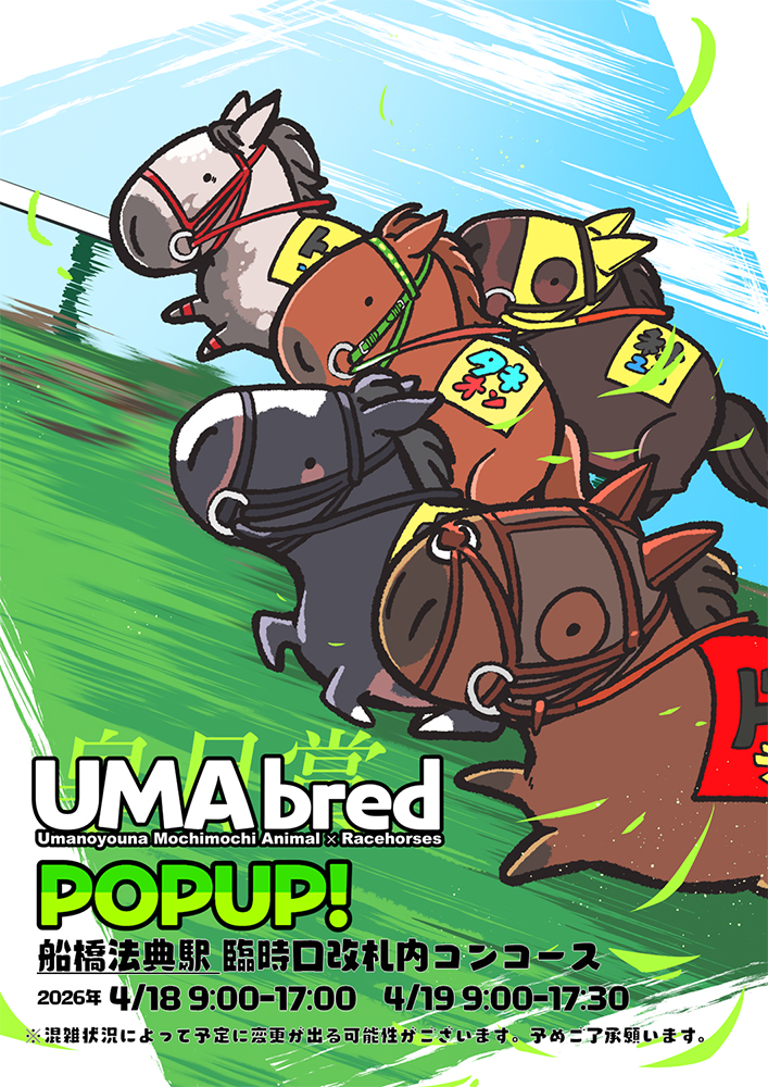 実在の競走馬・引退馬を「UMA」(ウマのようなモチモチアニマル)として描きおろすグッズブランド「UMAbred」は皐月賞の開催に合わせ、2026年4月18日(土)・4月19日(日)限定でJR船橋法典駅臨時口改札内コンコースにて出張POPUPを開催いたします。